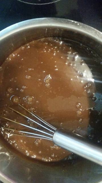 4. Ετοιμάζουμε την γκανάς. Σε ένα κατσαρολάκι ζεσταίνουμε την κρέμα γάλακτος.Προσοχή όχι να βράσει. Αποσύρουμε από την φωτιά και ρίχνουμε μέσα τα κομμάτια κουβερτούρας. Ανακατεύουμε καλά με το σύρμα μέχρι να ομογενοποιηθούν καλά τα δύο υλικά. Αφήνουμε να κρυώσει και να πήξει