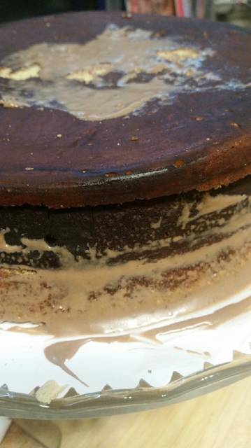 5. Για την συναρμολόγηση. Βγάζουμε την κρέμα πραλίνας από το ψυγείο. Τοποθετούμε το πρώτο παντεσπάνι σε μια πιατέλα με την λεία επιφάνεια προς τα κάτω. Με ένα κουτάλι της σούπας, καταβρέχουμε ελαφρώς το παντεσπάνι με το σιρόπι καραμέλας. Στην συνέχεια ρίχνουμε την μισή ποσότητα κρέμα πραλίνα και στρώνουμε με ένα μαχαίρι ζαχαροπλαστικής.