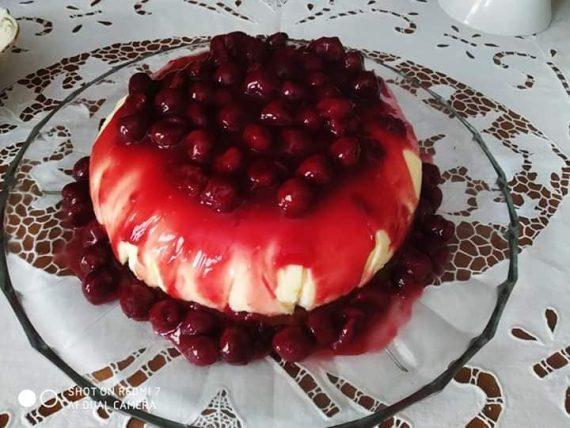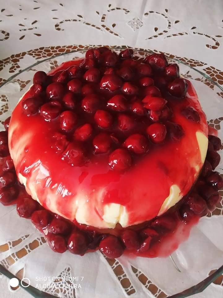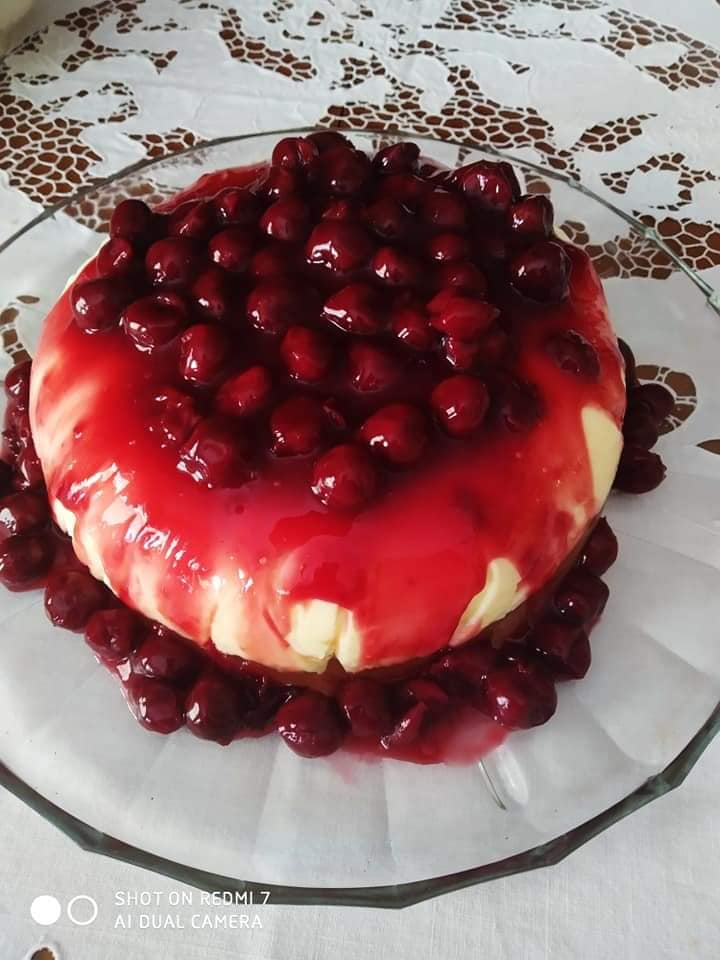 Στην συνέχεια το βάζουμε σε μια φόρμα στρωμένη με μεμβράνη και το τοποθετούμε στο ψυγείο για τουλάχιστον έξι ώρες. Αφού περάσουν οι έξι ώρες και το ζελέ μας έχει παγώσει καλά το ξεφορμάρουμε σε μια πιατέλα και ρίχνουμε από πάνω την κρύα πλέον σάλτσα βύσσινο που έχουμε φτιάξει με την κομπόστα. Έτοιμο!