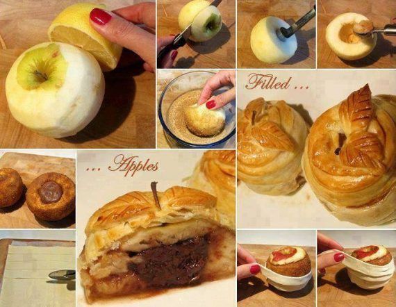 Φθινόπωρο έχουμε….Εποχή του φουλ μήλου είναι…. Και να μια ωραία ιδέα για ένα εντυπωσιακό επιδόρπιο…. Υλικά. Μήλα, Σφολιάτα, Καστανή Ζάχαρη, Νουτέλα, Μισό λεμόνι. 1 αυγό για την επάλειψη. Εκτέλεση: Πέρνετε ένα ένα μήλο, το ξεφλουδίζετε και το περνάτε εξωτερικά με το λεμόνι για να μην μαυρίσει. Κόβετε το πάνω μέρος και το κρατάτε για καπάκι. Βγάλτε τα κουκούτσια με το ειδικό εξάρτημα όπως και στην φώτο (διαφορετικά με ένα μαχαιράκι προσεκτικά). Και αδιάστε λίγο με ένα κουταλάκι. Το γεμίζετε με μια κουταλιά νουτέλα, το πασπαλίζετε με την ζάχαρη, και το καπακώνετε με το καπάκι του. Κόβετε όπως στην φωτογραφία λωριδούλες την σφολιάτα, και τυλίγετε το μήλο γύρο γύρο. Κάνετε και δυο φυλλαράκια για ντεκόρ, περνάτε με το αυγό για να γυαλίσει…Ψήνετε στους 180 βαθμούς μέχρι να ψηθεί η σφολιάτα. Enjoy ελπίζω να σας αρέσει!!!!