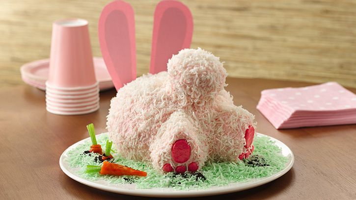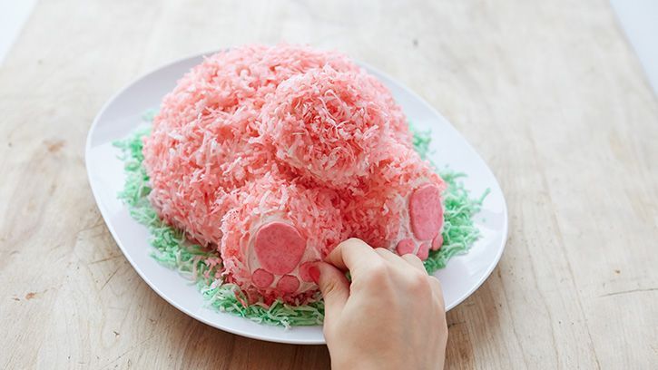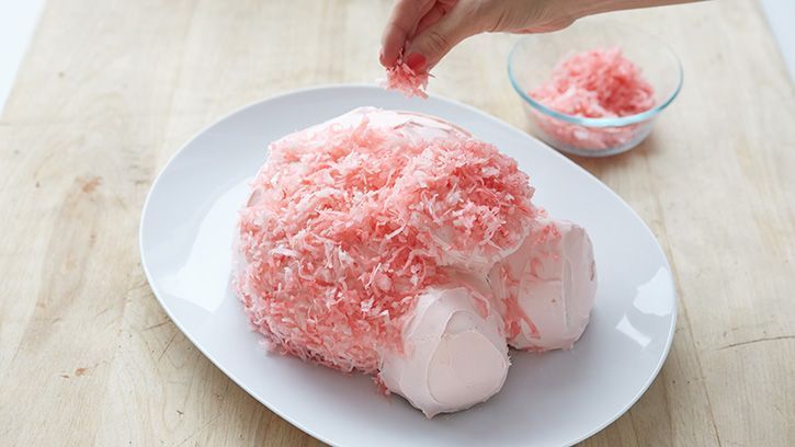 4. Μετά απλώστε το υπόλοιπο γλάσο πάνω από το κέικ. Ανακινήστε την καρύδα και μερικές σταγόνες χρωστικές τροφίμων σε ένα καλυμμένο δοχείο για να επιτευχθεί το επιθυμητό χρώμα, τόσο για το κουνελάκι όσο και για το γρασίδι και πασπαλίστε με αυτό το κέικ.Πιέστε απαλά να κολλήσουν.