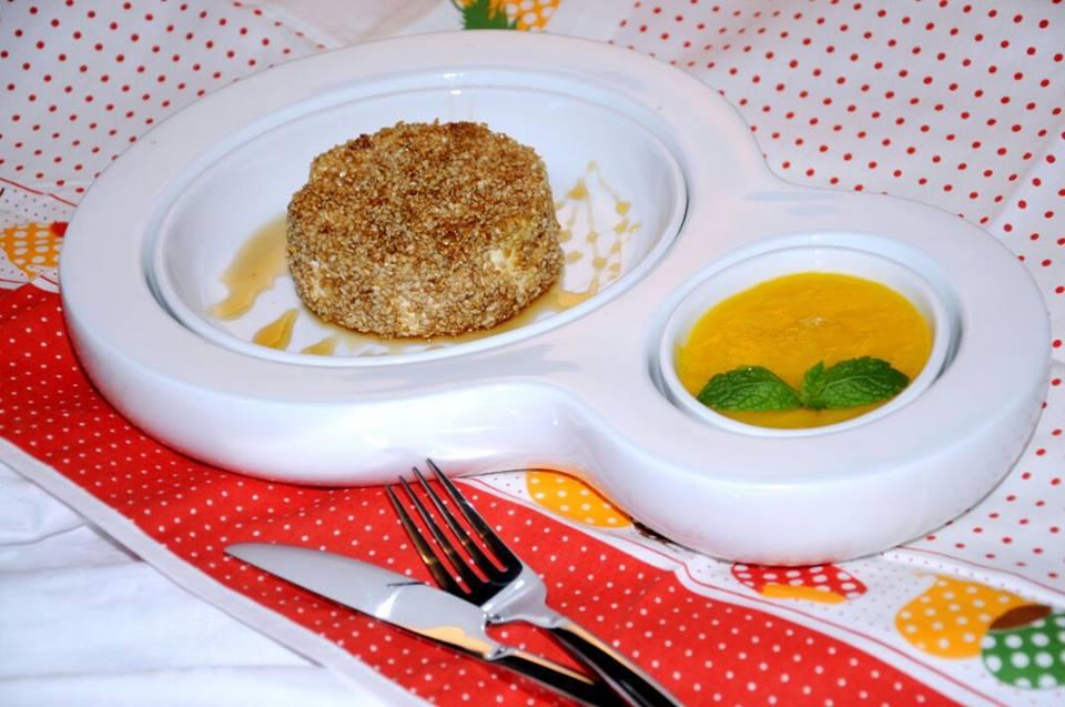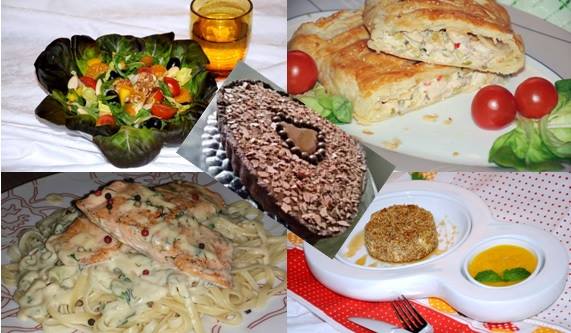 Κατσικίσιο τυρί με ντιπ μάνγκο Ζουμερό στρουντελ με κοτόπουλο και κρεμ φρες Πράσινη σαλάτα με Sauce πορτοκάλι -γιαούρτι Σολωμός με χρωματιστή πιπεριά σε άσπρη σάλτσα Κατσικίσιο τυρί με ντιπ μάνγκο
