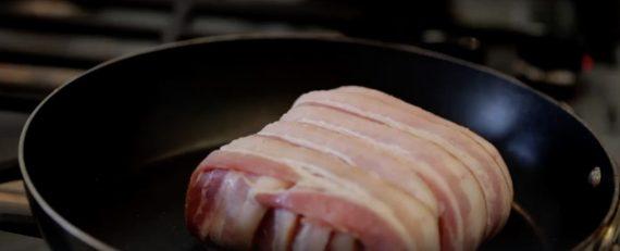Τοποθετήστε το σάντουιτς τυλιγμένο με μπέικον σε ένα καυτό τηγάνι (μέτρια υψηλή φωτιά)