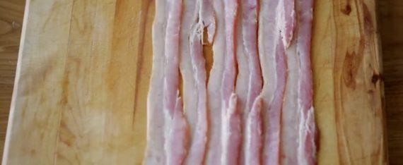 Συστατικά Μπέικον (10 λωρίδες) Ψωμί (2 φέτες) Τυρί (1-2 φέτες) Βάλτε 5 λωρίδες μπέικον στη σειρά.Τοποθετήστε με αυτή τη σειρά ψωμί, τυρί, ψωμίστη μέση των λωρίδων μπέικον.