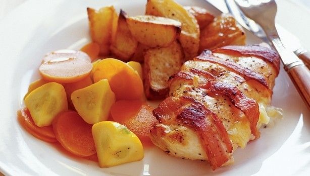 1 στήθος κοτόπουλου κομμένο κάθετα στα δύο 6 κ.σ. ελαιόλαδο 2 φέτες τυρί του τόστ κομμένο στη μέση 4 φέτες μπέϊκον κομμένο στη μέση κατά μήκος πατάτες καρότα κολοκύθια για συνοδευτικό [προαιρετικά] αλάτι πιπέρι