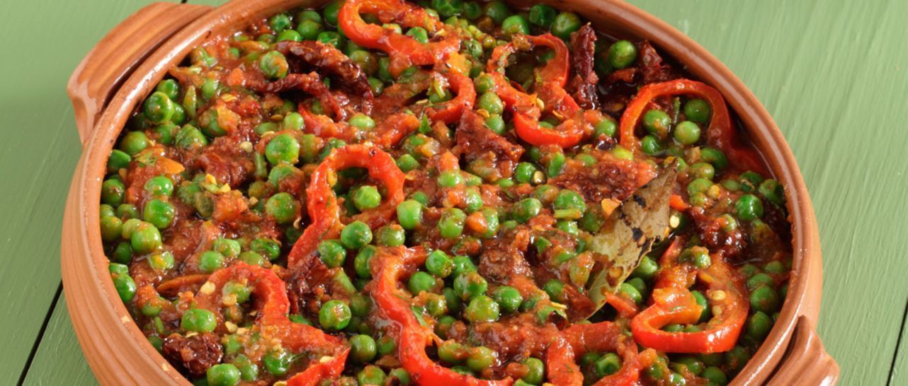 Παρασκευή- Αρακάς σε πήλινο στο φούρνο με λιαστές ντομάτες και καυτερή πιπεριά