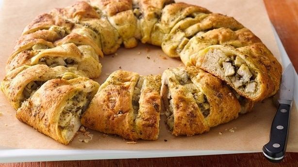 3 στήθη κοτόπουλου φιλέτο, βρασμένα κομμένα σε κυβάκια 1,20 εκ. περίπου (2 ½ φλ. κυβάκια περίπου) 1/3 φλ. τσαγιού + 1 κ.σ. επιπλέον πέστο βασιλικού 1 φλ. τσαγιού (120 γρ.) γραβιέρα ήπιας γεύσης ή άλλο κίτρινο τυρί επιλογής σας (γκούντα, ένταμ κ.λ.π.) τριμμένα 2 συσκευασίες φρέσκια ζύμη κρουασάν Pillsbury (των 230 γρ. η κάθε συσκευασία)
