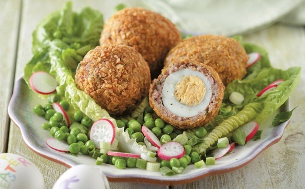 Τρίτη- Βραστά αβγά παναρισμένα με κιμά από λουκάνικο