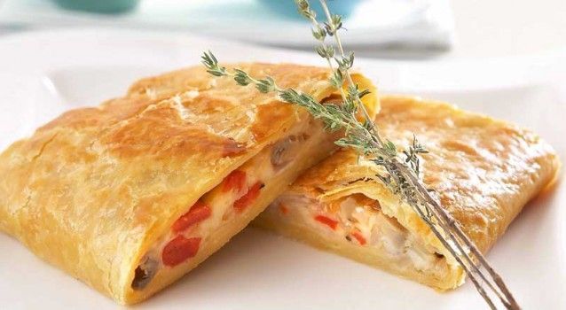 Σοτάρουμε στη 1 κ.σ. ελαιόλαδο τις πιπεριές και τα μανιτάρια σε μέτρια θερμοκρασία μέχρι να μαλακώσουν, τα βγάζουμε και τα τοποθετούμε σε απορροφητικό χαρτί. Ανοίγουμε το κάθε φύλλο σφολιάτας, κόβουμε σε τέσσερα κομμάτια (συνολικά 8 πιτάκια) και μοιράζουμε την γέμιση που έχουμε φτιάξει ανακατεύοντας όλα τα υλικά εκτός από το βούτυρο. Κλείνουμε την σφολιάτα φτιάχνοντας παραλληλόγραμμα πιτάκια βάζοντας τις άκρες νερό για να κολλήσουν. Αλείφουμε την επιφάνεια τους με το λιωμένο βούτυρο και ψήνουμε σε φούρνο προθερμασμένο στους 180° για 40 λεπτά. Τα σερβίρουμε αμέσως ζεστά.