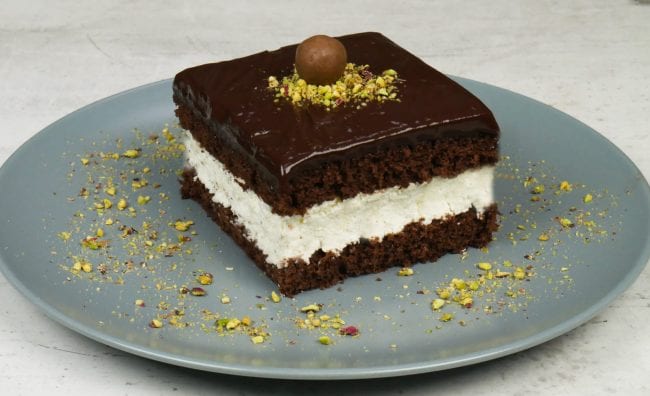 Συστατικά Παντεσπάνι 4 αυγά 165 γρ φαρίνα 200 γρ ζάχαρη 3 κουταλιές κακάο 2 βανίλιες Γέμιση 400 ml κρέμα γάλακτος 100 γρ ινδοκάρυδο Επικάλυψη σοκολάτας 200 ml γάλα 200 ml νερό 160 γρ ζάχαρη 1½ κουταλιά αλεύρι 2 κουταλιές κακάο