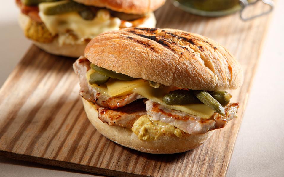 Κυριακή- Μπέργκερ με χοιρινά μπριζολάκια, μουστάρδα και αγγουράκι τουρσί