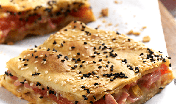 Αφήνετε τα φύλλα εκτός ψυγείου 20-30 λ για να μαλακώσουν. Προθερμαίνετε το φούρνο στους 180 βαθμούς και αλείφετε ένα μακρόστενο πυρέξ με λάδι ή βούτυρο. Τρίβετε τα τυριά, τα βάζετε σε μπολ και τα ανακατεύετε να αναμειχθούν. Κόβετε το ζαμπόν σε κομματάκια και όλες τις πιπεριές σε ροδέλες και τα αφήνετε στην άκρη. Στρώνετε στο βουτυρωμένο πυρέξ το 1 χοντρό φύλλο. Προσθέτετε από πάνω, ισομερώς σε όλη την επιφάνεια το 1/3 του μείγματος των τριμμένων τυριών. Από πάνω στρώνετε το ζαμπόν και τις πιπεριές και τα σκεπάζετε με το άλλο 1/3 των τυριών. Τοποθετείτε από πάνω τις ντομάτες σε ροδέλες, τη μια δίπλα στην άλλη, τις αλατίζετε ελαφρώς και τις πασπαλίζετε με το ψιλοκομμένο μαϊντανό. Τελειώνετε με άλλη μια στρώση με το υπόλοιπο 1/3 τυριών. Σκεπάζετε με το δεύτερο φύλλο, το οποίο αλείφετε με το υπόλοιπο βούτυρο ή λάδι. Πασπαλίζετε [προαιρετικά] με το σουσάμι και ψήνετε τη πίτα στο προθερμασμένο φούρνο για 45-50 λ. Τη βγάζετε από το φούρνο, την αφήνετε να “σταθεί” για 5-10 λ, τη κόβετε σε κομμάτια και σερβίρετε.