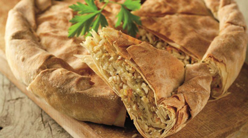 Ραντίζετε την πίτα με λίγο νερό και την ψήνετε στους 180°C για 45-50 λεπτά, μέχρι να πάρει ένα χρυσαφένιο χρώμα.