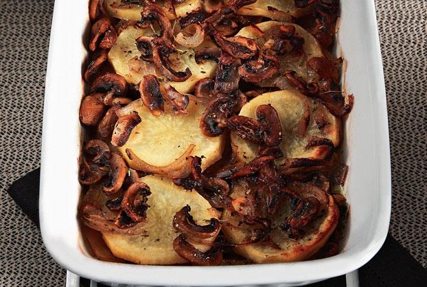 Σε λαδωμένο πυρίμαχο σκεύος (οβάλ κατά προτίμηση) στρώνουμε μία στρώση λεπτοκομμένες πατάτες (τη μισή ποσότητα). Ραντίζουμε με λίγο ελαιόλαδο και αλατοπιπερώνουμε. Σκεπάζουμε τις πατάτες με μία στρώση μανιτάρια. Στρώνουμε τις υπόλοιπες πατάτες σε άλλη μία στρώση. Τις αλατοπιπερώνουμε και τις ραντίζουμε με λίγο ελαιόλαδο. Τέλος προσθέτουμε τα υπόλοιπα μανιτάρια σε μία στρώση.