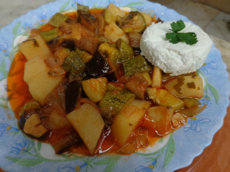 5 κολοκυθάκια μέτρια κομμενα σε κυβάκια 2-3 μελιτζάνες μέτριες κομμένες σε κυβάκια 5 πατάτες μέτριες κομμένες σε κυβάκια 1 ματσάκι μαιντανό ψιλοκομμένο 2 ξερά κρεμμύδια κομμένα σε λεπτά μακρόστενα κομμάτια 2 σκελίδες σκόρδο κομμένες σε ροδέλες αλάτι πιπέρι 2 κουταλιές τις σούπας πελτέ αραιωμένο σε ένα ποτήρι νερό 2 ποτήρια νερό 1/2 φλυτζάνι του τσαγιού ελαιόλαδο