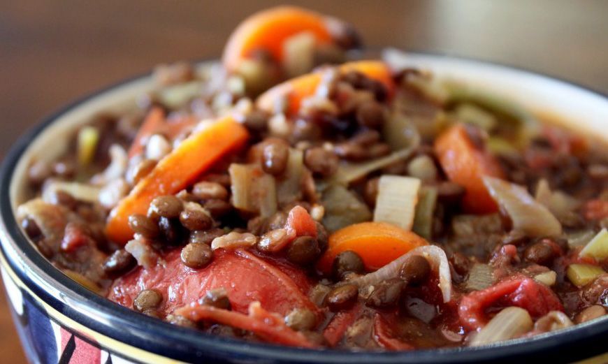 500 γραμμ. φακές χοντρές 2 σκελίδες σκόρδο 1 κρεμμύδι κομμένο σε φέτες 6 κουτ. σούπας ελαιόλαδο 1 κουτ. σούπας πελτέ ντομάτας 2 κουτ. σούπας ξύδι 1 κουτ. σούπας ρίγανη 1 σπιτικός ζωμός μυρωδικών (διαλυμένος σε 1 1/2 λίτρο νερό)