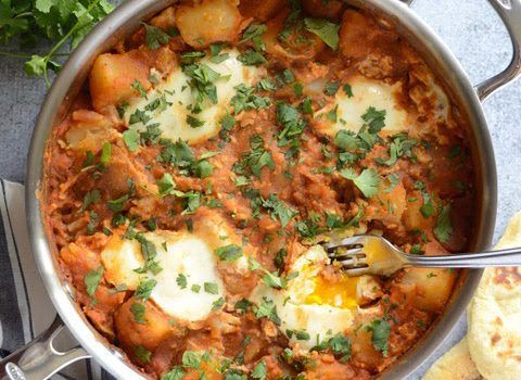 Πέμπτη- Πατάτες σε σάλτσα ντομάτας κάρυ και αυγά ποσέ