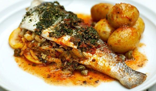 Σάββατο- Λαβράκι με πατάτες και ντομάτα στο φούρνο