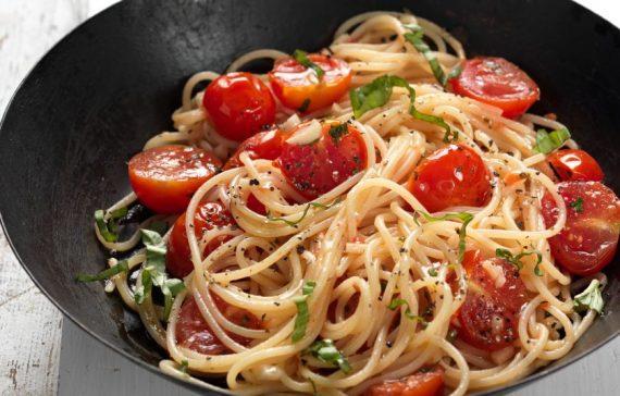 1 πακέτο σπαγκέτι 2 σκελίδες σκόρδου, λιωμένες 100 ml ελαιόλαδο 500 γρ. ντοματίνια, στη μέση 1 φλιτζ. τσαγιού φυλλαράκια βασιλικού, ψιλοκομμένα (ή 1/2 κουτ. σούπας ξερός, τριμμένος) αλάτι, πιπέρι φρεσκοτριμμένο 200 γρ. παρμεζάνα, τριμμένη Διαδικασία Βράζουμε τα μακαρόνια σε μπόλικο αλατισμένο νερό που κοχλάζει. Εν τω μεταξύ, σε μια άλλη φαρδιά κατσαρόλα, ή σε ένα μεγάλο τηγάνι, σοτάρουμε στο μισό από το μετρημένο ελαιόλαδο το σκόρδο σε δυνατή φωτιά για 20 δευτερόλεπτα. Προσθέτουμε τα ντοματίνια και αλάτι και μαγειρεύουμε σε μέτρια φωτιά για περίπου 3 – 4 λεπτά μέχρι να βγάλουν υγρά.