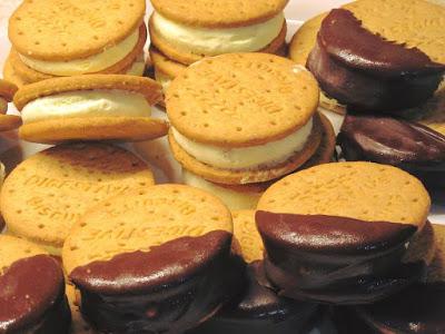 Σκεπάζουμε με το άλλο μπισκότο μας και φτιάχνουμε τα σάντουιτς. Η ποσότητα βγάζει γύρω στα 40 τεμ ανάλογα το μέγεθος του μπισκότου! Μπορούμε εναλλακτικά να βουτήξουμε το μισό, σε λιωμένη σοκολάτα και σε ψιλοκομμένους ξηρούς καρπούς, μπορούμε μέσα να ψιλοκόψουμε φρούτα.