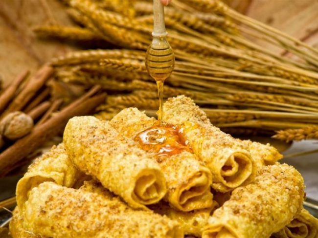 Αραιώνουμε το μέλι με 1 φλ. νερό και περιχύνουμε τις δίπλες με προσοχή να μελωθούν όλες. Πασπαλίζουμε με καρύδια και κανελογαρύφαλλο..