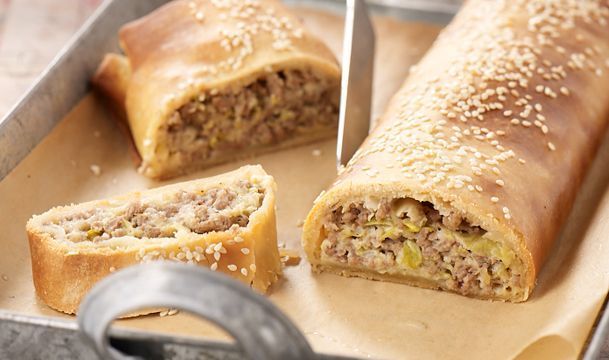 1Για αρχή, μια ιδέα είναι να ζεστάνεις σε ένα φαρδύ τηγάνι το Βιτάμ και να σοτάρεις τον κιμά με το μπαχάρι, το μείγμα μπαχαρικών, το μοσχοκάρυδο και το αλατοπίπερό του σε δυνατή φωτιά. Προαιρετικά, μπορείς να προσθέσεις στον κιμά μισή συσκευασία τομάτα κονκασέ. 2Μετά μπορείς να σβήσεις με το κρασί, να χαμηλώσεις τη φωτιά και να αφήσεις τον κιμά να σιγομαγειρευτεί για 15 περίπου λεπτά, μέχρι να απορροφήσει τα υγρά του. 3Πάει αυτό… Σε ένα άλλο τηγάνι ζέστανε το ελαιόλαδo και σόταρε το πράσο με το αλάτι του, μέχρι να μαλακώσει και να ροδίσει. 4Κατέβασε τώρα από τη φωτιά τον κιμά και το πράσο, άφησέ τα δύο μείγματα να κρυώσουν και ένωσέ τα προσθέτοντας το μαϊντανό, τα αβγά, το τυρί και το πιπέρι. 5Άνοιξε 4 φύλλα και κόψε το καθένα σε φαρδιές λωρίδες. Μοίρασε ακριβοδίκαι τη ζύμη στην άκρη κάθε λωρίδας, δίπλωσε προς τα μέσα τις άκρες και τύλιξε σε ρολό, όπως είναι η φρατζόλα του ψωμιού. Αν θέλεις η κρούστα να βγει γυαλιστερή, άλειψέ τη με ένα μείγμα από 1 αβγό, 2 κ.σ. νερό και 2 κ.σ. Bιτάμ λιωμένο. 6Άλειψε ένα ρηχό ταψί του φούρνου με Bιτάμ και βάλε τα ρολά έτσι ώστε να μην κολλάνε μεταξύ τους. Άλειψέ τα καλά με Bιτάμ, ράντισε με νερό, πασπάλισε με σουσάμι και ψήσε για 40 περίπου σε προθερμασμένο φούρνο στους 180°C, μέχρι να ροδίσουν.