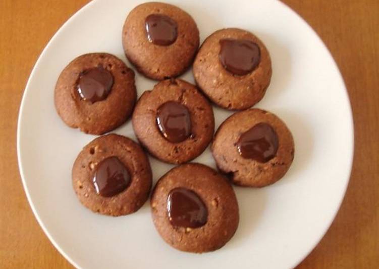 Αφού ψηθούν, τα αφήνουμε σε σχάρα να κρυώσουν και τότε λιώνουμε τα 100 γρ. της κουβερτούρας (σε μπαιν μαρί ή στο φούρνο μικροκυμάτων), που βάζουμε με ένα κουταλάκι στην λακκουβίτσα που είχαμε σχηματίσει στην επιφάνεια των μπισκότων. Αφήνουμε και πάλι να κρυώσουν, χωρίς να ακουμπάνε το ένα με το άλλο.