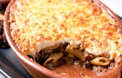 Ελαιόλαδο: 3 κουταλιές Ψιλοκομμένο κρεμμύδι: 1 μεγάλο Μοσχαρίσιο κιμά: 700 γρ. Ψιλοκομμένη, ξεφλουδισμένη ντομάτα: 800 γρ. Ξερό θυμάρι, ρίγανη: από 1/2 κουταλάκι Αλάτι, πιπέρι: όσο χρειαστεί Πένες: 500 γρ. Τριμμένη παρμεζάνα: 1/2 κούπα και 3 – 4 κουταλιές επιπλέον Ζεστό γάλα: 5 κούπες Βούτυρο: 10 κουταλιές Αλεύρι: 10 κουταλιές άσπρο πιπέρι, μοσχοκάρυδο: από 2 πρέζες Τριμμένη φρυγανιά: 2 κουταλιές