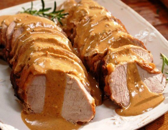 Αλείφουμε το χοιρινό με βούτυρο και το βάζουμε σε μια κατσαρόλα. Μαγειρεύουμε για λίγα λεπτά και στη συνέχεια προσθέτουμε το κρασί και μετά από λίγο ρίχνουμε και το γάλα μέχρι να καλύψει το κρέας και μαγειρεύουμε περίπου για μι ώρα. Μόλις ψηθεί κόβετε το κρέας σε φέτες και σερβίρετε με τη σάλτσα.