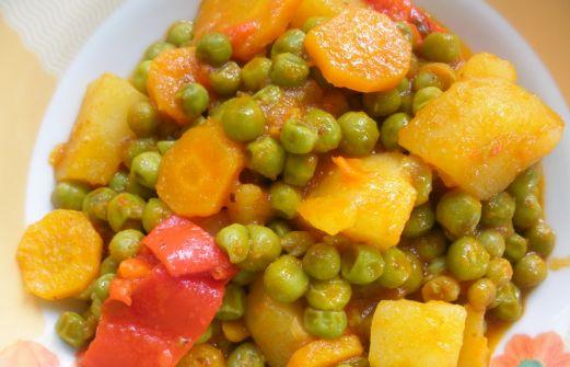 500γρ αρακα κατεψυγμενο 2 μετριες πατατες κομμενες σε κυβους 2 καροτα κομμενα σε ροδελες 1 πιπερια φλωρινης κομμενη σε χοντρες ροδελες 1/2 μικρο κρεμμυδι ψιλοκομμενο 1 κουπα χυμο ντοματας 1,5 κουπα νερο αλατι ελαιολαδο
