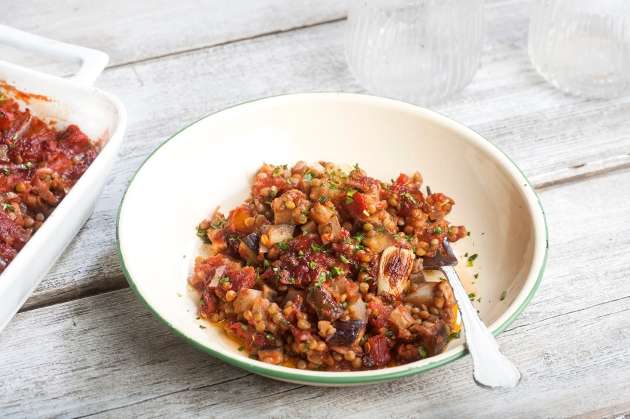 Επαναλαμβάνουμε στρώση με το μισό μείγμα λαχανικών, στρώση με τις υπόλοιπες μελιτζάνες και στρώση με τις υπόλοιπες φακές και ρεβύθια. Τέλος ρίχνουμε στην επιφάνεια του φαγητού το υπόλοιπο μείγμα λαχανικών. Περιχύνουμε με το ελαιόλαδο και με σιρόπι ρόδι ή σιρόπι μπαλσάμικο.