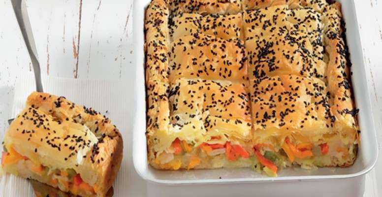 Καλύπτουμε τον πυθμένα του ταψιού με 5 φύλλα κρούστας, τα οποία λαδώνουμε με πινέλο ένα-ένα. Από πάνω τοποθετούμε 1 ακόμη φύλλο χωρίς να το λαδώσουμε και αδειάζουμε πάνω του τη γέμιση. Σκεπάζουμε με τα υπόλοιπα φύλλα λαδώνοντάς τα ένα-ένα. Πασπαλίζουμε την επιφάνεια της πίτας με μαυροσούσαμο και τη χαράζουμε όπως θέλουμε με ένα μαχαίρι (το μαχαίρι να μην φτάνει μέχρι κάτω). Ψήνουμε για περίπου 35 λεπτά ή μέχρι να ροδίσει η πίτα.