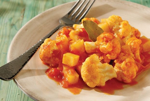 2. Σε πλασοτέ κατσαρόλα σοτάρουμε στο ελαιόλαδο και σε χαμηλή φωτιά το κρεμμύδι ώσπου να γυαλίσει και να γίνει διάφανο (για 5΄-6΄). Προσθέτουμε την πατάτα, το καρότο, τη δάφνη και σοτάρουμε για 2΄-3΄ επιπλέον. Τέλος, προσθέτουμε το κουνουπίδι και τα ντοματάκια. Αλατοπιπερώνουμε το γιαχνί, ρίχνουμε μία πρέζα ζάχαρη και κλείνουμε την κατσαρόλα.