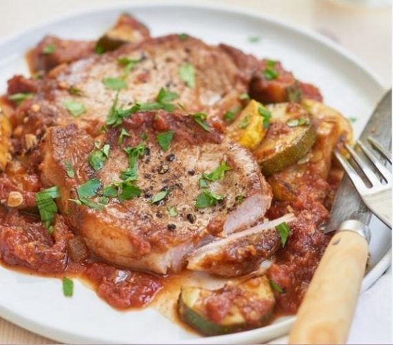 Πέμπτη- Χοιρινά μπριζολάκια με σάλτσα ντομάτας και κολοκυθάκια