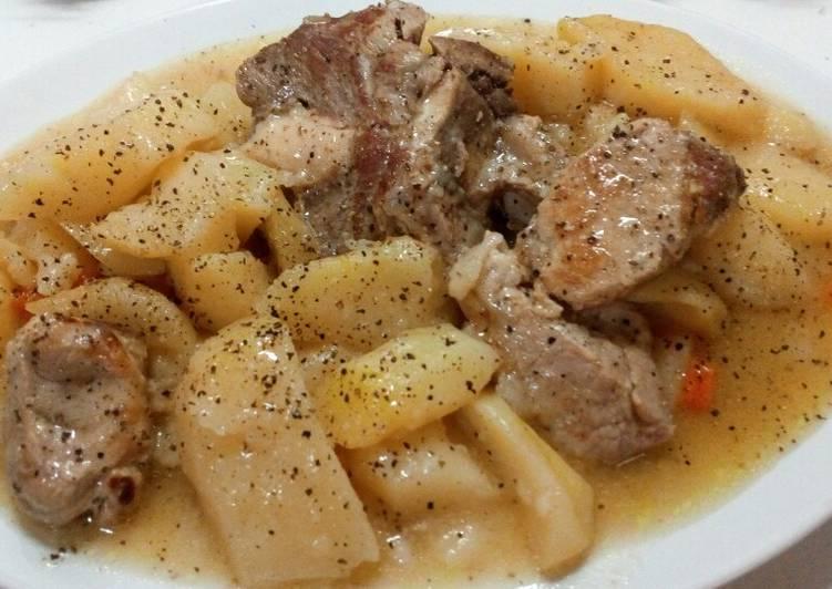 Προσθέτουμε νερό να σκεπάζει το φαγητό μας κ βράζουμε σε μέτρια προς σιγανή φωτιά για 1h περίπου κουνωντας κυκλικά την κατσαρόλα μας που κ που. Μόλις περάσει η μία ώρα κ δούμε με ένα πιρούνι πως είναι έτοιμες οι πατάτες αλλά κ το χοιρινό τσιμπιετε με ευκολία, αφήνουμε ξεσκέπαστη την κατσαρόλα μας κ βράζουμε έτσι για αλλά 5′-10′ έως ότου δέσει η σάλτσα μας κ το φαγητό μας έχει γλασαριστει.. Σερβίρουμε αφου κρυώσει λίγο πρώτα με φρεσκοτριμμένο πιπέρι κ απολαμβάνουμε! Καλή επιτυχία!!!