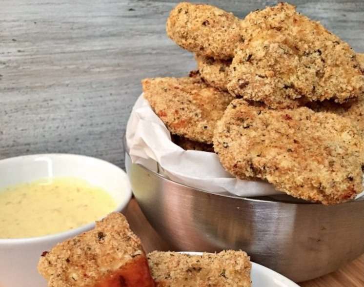 Ρίξε το τρίμμα ψωμιού σε ένα πιάτο και πανάρισε καλά τα κομμάτια κοτόπουλου. Ψήσε σε προθερμασμένο φούρνο στους 190°C για 10 λεπτά, γύρισε τις κοτομπουκιές και συνέχισε το ψήσιμο για άλλα 4-5 λεπτά. Συνόδευσε με σάλτσα μουστάρδας ή με γλυκιά σάλτσα τσίλι.