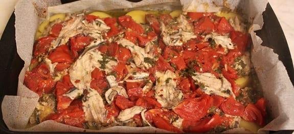 Σάββατο-Γαύρος με ντομάτα, πατάτες και κρεμμύδια στο φούρνο