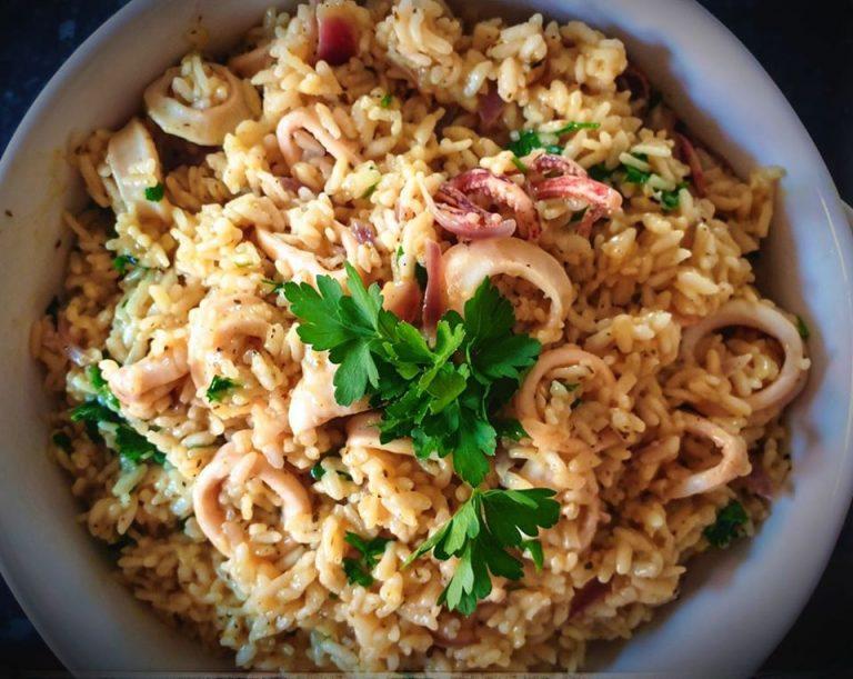 Μεσημεριανό: Καλαμαράκια με ρύζι, σκόρδο και κουρκουμά στο τηγάνι!