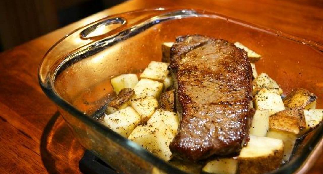 Τοποθετείστε την μπριζόλα πάνω από τις πατάτες και αφού ο φούρνος έχει ζεσταθεί την ψήνεται για περίπου 30 λεπτά.