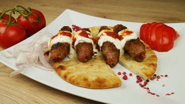 Οδηγίες Αλέθουμε την πιπεριά στο μπλέντερ. Στον κιμά (που μπορεί να είναι και μίξη από μοσχαρίσιο με αρνίσιο) βάζουμε την πιπεριά, την ρίγανη, την καπνιστή πάπρικα, το κύμινο, την σκόνη για ψητά, αλάτι, πιπέρι, λίγο ελαιόλαδο και δουλεύουμε πολλή καλά να αφρατέψει. Βουτάμε το χέρι μας στο νερό, πέρνουμε λίγο κιμά και σε 2 ξυλάκια για σουβλάκια πλάθουμε τα κεμπάπ. Τα βάζουμε σε καυτό αντικολλητικό σχαροτήγανο και φροντίζουμε να πάρουν χρώμα από όλες τις πλευρές. Σε ένα κατσαρολάκι βράζουμε την σάλτσα μαζί με την καυτερή πάπρικα, το σκόρδο σε σκόνη και το κρασί μέχρι που να δέσει. Πριν σερβίρουμε ζεσταίνουμε τις πίτες στο ίδιο σχαροτήγανο χωρίς να το ξεπλύνουμε. Σερβίρουμε τα κεμπάπ με στραγγιστό γιαούρτι και σάλτσα.