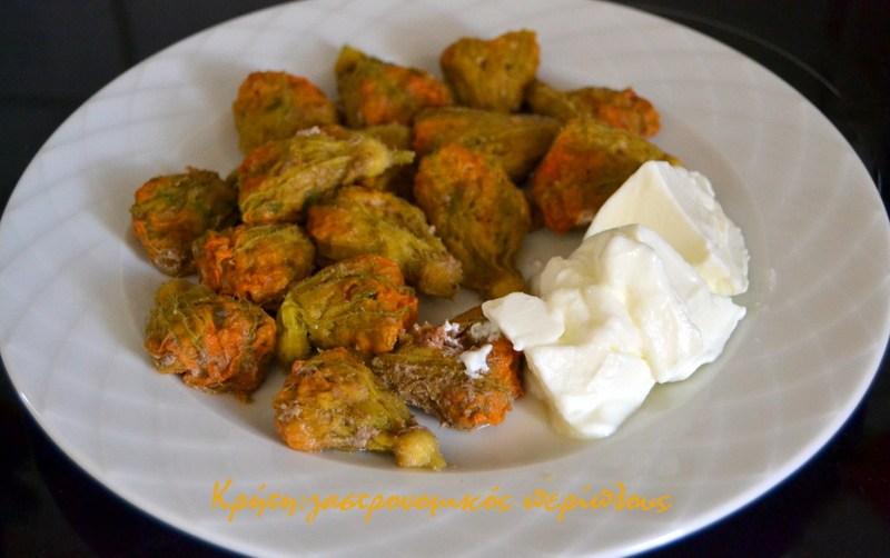 Υλικά: Κολοκυθοανθοί (κατά προτίμηση «αρσενικοί» , αλλά κάνουν και αυτοί από τα κολοκυθάκια) 1 κουταλιά ξινομυζήθρα για κάθε ανθό (ή μια κουταλιά μικρούς κύβους κρητικής γραβιέρας ) ½ -1 φυλλαράκι αβάρσαμο ( δυόσμο) για κάθε ανθό αν χρησιμοποιήσουμε ξινομυζήθρα Κουρκούτι (για τους 12 που γέμισα, έφτιαξα 1 δόση) Ελαιόλαδο για το τηγάνισμα