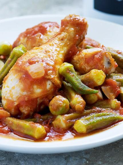 Στραγγίζετε τις μπάμιες αν έχει μείνει ξίδι στο ταψί. Τις στρώνετε γύρω από τα κομμάτια του κοτόπουλου έτσι ώστε να σκεπαστούν με τη σάλτσα της ντομάτας. Σκεπάζετε το φαγητό και αφήνετε να σιγοβράσει για 15-20 λεπτά μέχρι να ψηθούν οι μπάμιες. Σερβίρετε το φαγητό ζεστό.