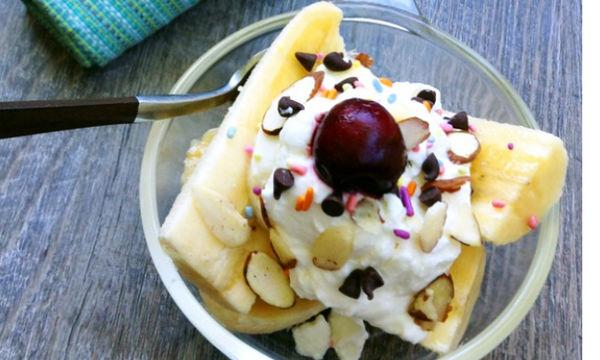 *Βάλτε σε ένα μπολ κομματάκια μπανάνας, από πάνω 2 κουταλιές της σούπας γιαούρτι (μπορείτε να χρησιμοποιήσετε και frozen yogurt με γεύση βανίλια) και να βάλει από πάνω ό,τι θέλει για να το διακοσμήσει.