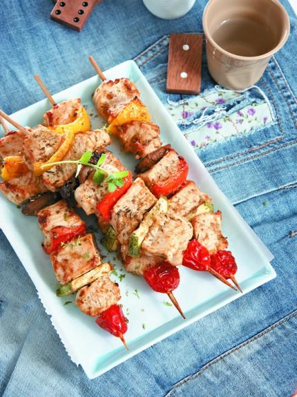 Περνάτε το κρέας σε ξύλινα σουβλάκια εναλλάξ με τα λαχανικά. Ψήνετε στο γκριλ του φούρνου στους 180˚C για 20 λεπτά περίπου. Συνοδεύετε με ρυζάκι, ψημένες πιτούλες ή άλλη γαρνιτούρα της αρεσκείας σας.