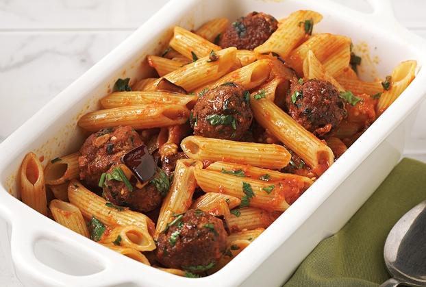 Τρίτη-Πένες με κεφτεδάκια σε σάλτσα ντομάτας με μελιτζάνα