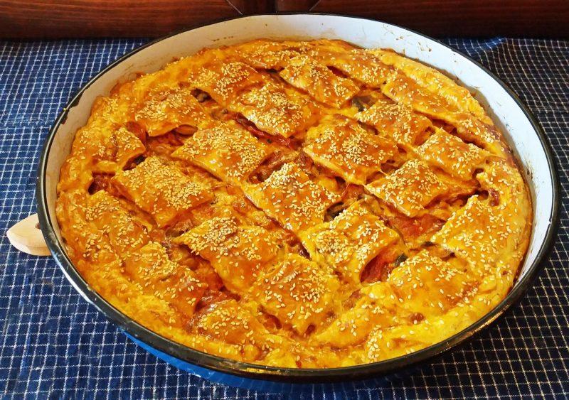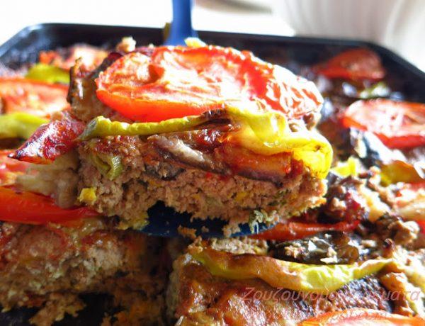 Μεσημεριανό: Μπιφτέκι ταψιού με μελιτζάνα, ντομάτες και πιπεριές στο φούρνο