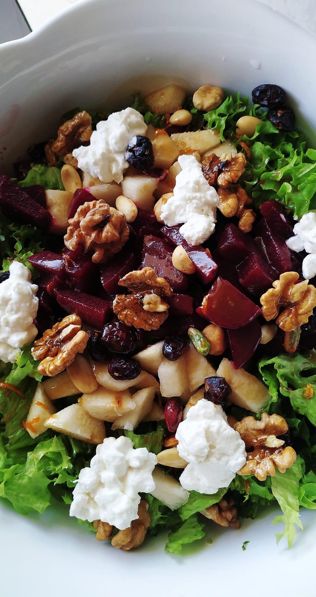 Πράσινη σαλάτα με παντζάρια, ανθότυρο ξηρούς καρπούς