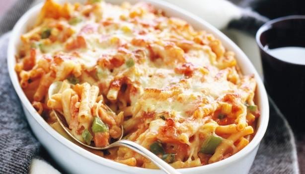 Τρίτη- Πένες στο φούρνο με καπνιστό χοιρινό, ντομάτα και γραβιέρα