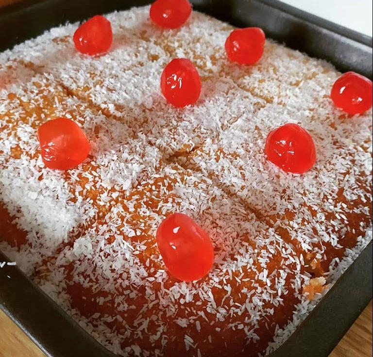 Σιροπιασμένο γλυκό ταψιού με ινδοκάρυδο τύπου ραβανί