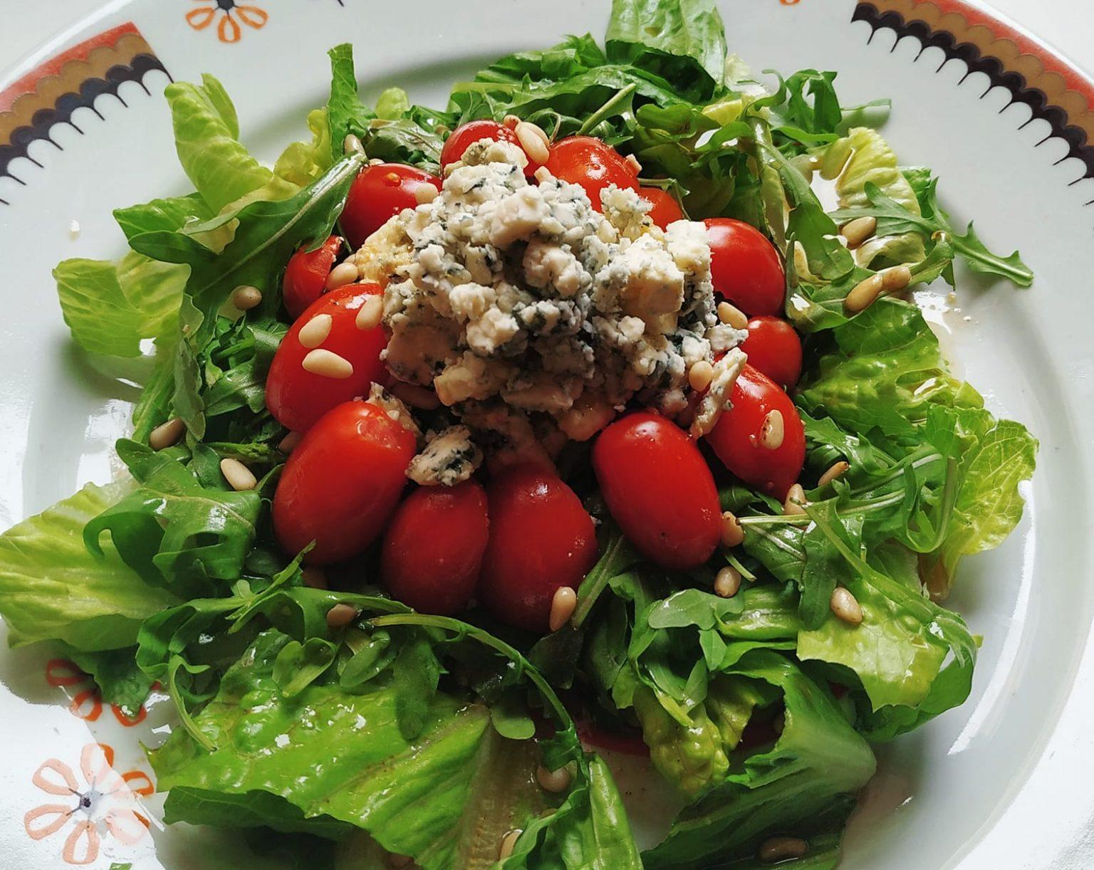 Δροσερή πράσινη σαλάτα με ροκφόρ, ντοματίνια και σάλτσα μελιού